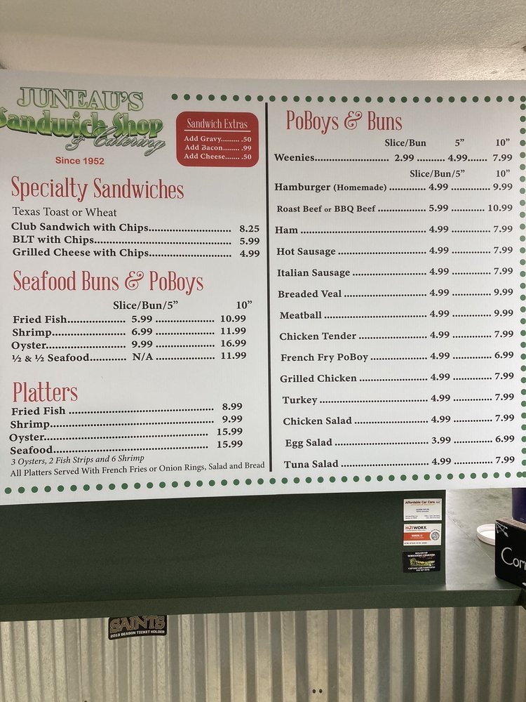 Juneau's Sandwich Shop is a beloved spot on the Westbank known for its nostalgic old-school feel and delicious sandwiches. With a varied menu offering classics like shrimp po-boys, French fry po-boys with gravy, and even a chicken salad po-boy, there's something for everyone. The fried shrimp po-boy is a standout, with generous portions of shrimp on the best po-boy bread in town. The friendly service, accommodating staff, and cozy ambiance make dining here a delightful experience. The owner's personal touch, sharing stories about the establishment's history and even treating guests to a complimentary weenie po-boy, adds an extra layer of charm. Juneau's Sandwich Shop is not just a place to eat; it's a classic New Orleans experience that keeps customers coming back for more. The perfect spot for a casual lunch or a quick bite with friends and family.